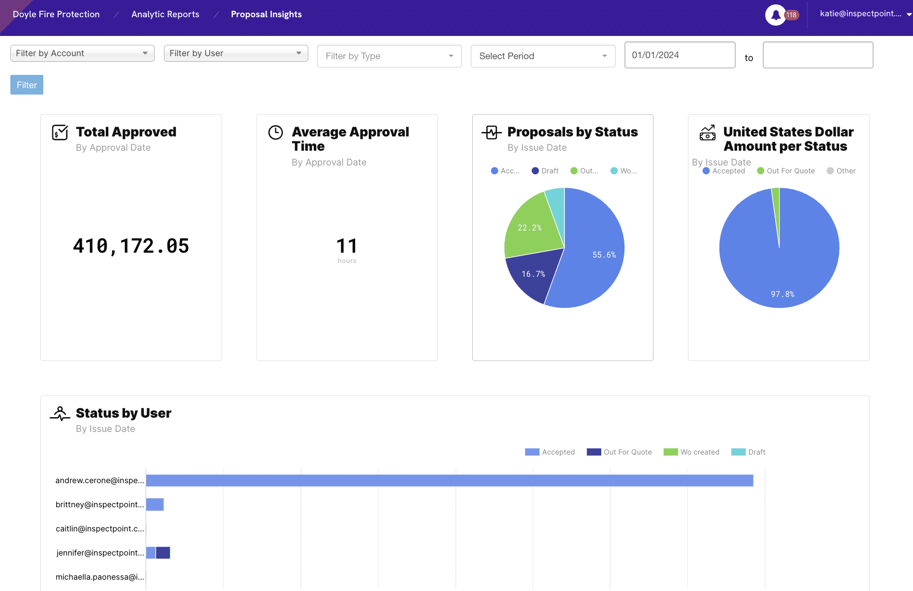 Inspect Point offers robust quoting reporting and analytics, including dashboards with data on average acceptance time, proposal count, and dollar amount by status, total approved, and more. In addition, individual sales users can access dashboards and data specific to their accounts.