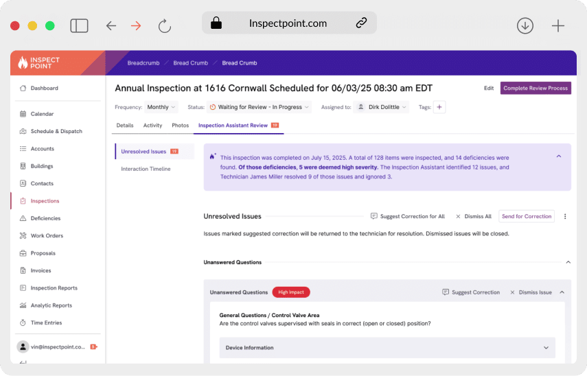 Get a quick overview of how Inspect Point simplifies fire and life safety management. Our platform streamlines key tasks like scheduling, inspections, and compliance reporting while still boosting efficiency and accuracy. Perfect for a high-level look at what Inspect Point can do for your business.