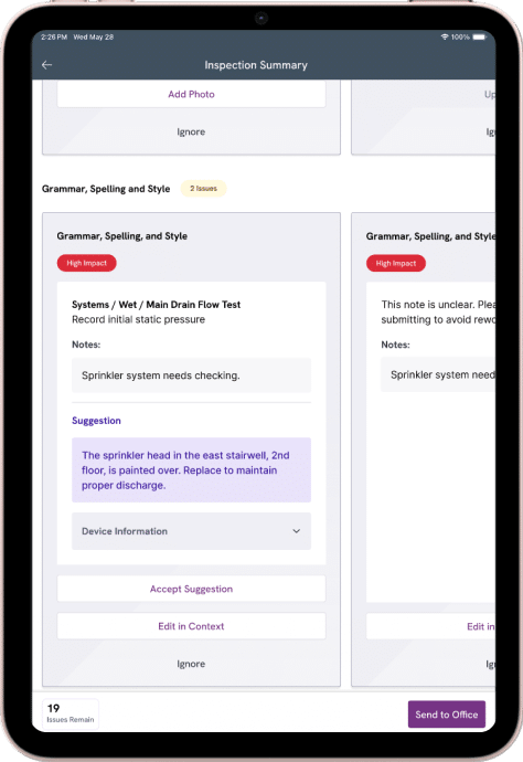 After inspection, AI runs a final pass to flag missing photos, incomplete or conflicting fields, and obvious errors (like mismatched device counts). Techs can resolve issues on-site, cutting revisits and reducing office back-and-forth.