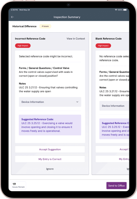 Inspection Assistant is your apprentice, not a replacement. AI-powered inspections auto-suggest pass/fail, pre-fill device data, and flag missing photos or notes—so you stay focused on the job, not the report. You’re always in control: accept, edit, or reject suggestions before anything is submitted. Finish faster, avoid callbacks, and walk off-site confident the report is solid—even when you’ve been working offline.