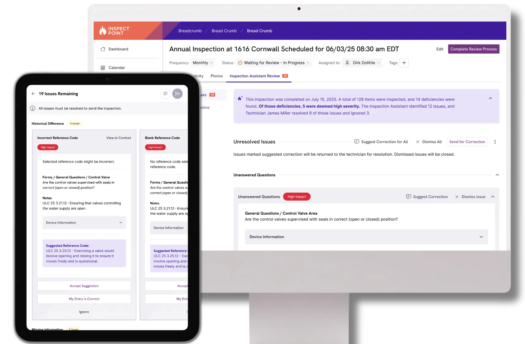Inspection Assistant helps produce customer and AHJ‑ready reports featuring detailed information that leads to clear next steps for compliance with the click of a button. Inspect Point’s integrated workflow helps you keep customers compliant by managing deficiency lifecycles all the way through to resolution.