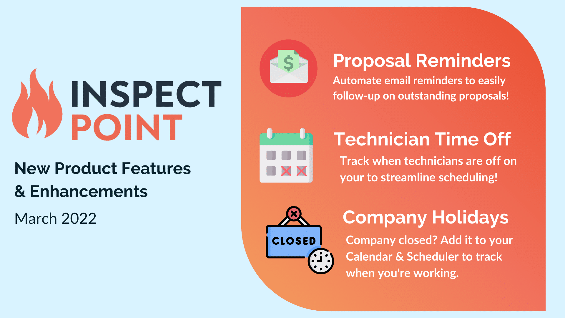 At Inspect Point HQ here in the Northeast, winter is still in full swing! We’re looking ahead to warmer weather, and in anticipation, we’ve started our “spring cleaning” early this year – working hard on product improvements, and new features, that we hope will make your job easier than ever.