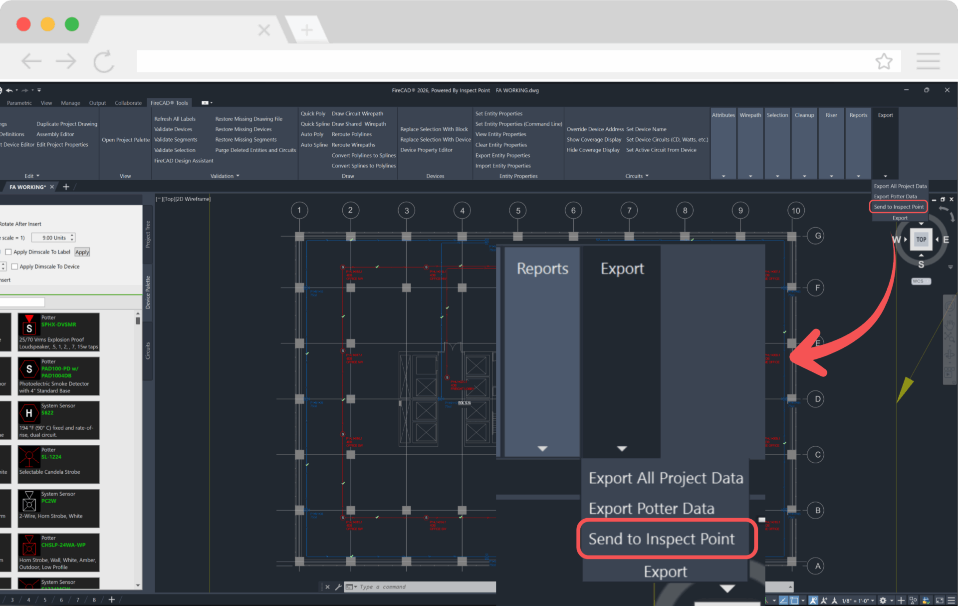 The FireCAD and Inspect Point integration bridges the gap between design and inspection, creating a seamless flow of data from your drawings to the field. With this connection, fire alarm system device lists/bill of materials can be pushed directly from FireCAD into Inspect Point — eliminating manual data entry and ensuring every device is ready for inspection scheduling and ongoing asset management.