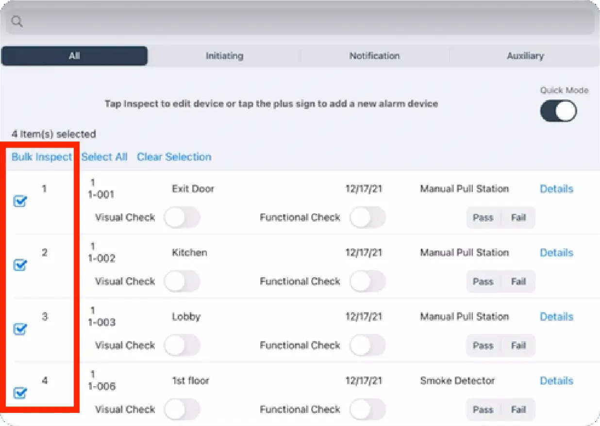 With Quick Inspect enabled, technicians no longer have to click into each individual inspection item to complete the inspection. Visual Check, Functional Check, and Pass/Fail appear under each device, allowing technicians to answer these questions without clicking into the individual item.